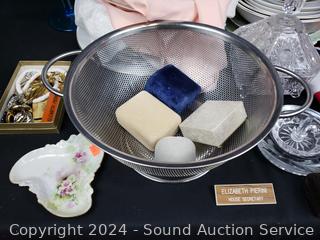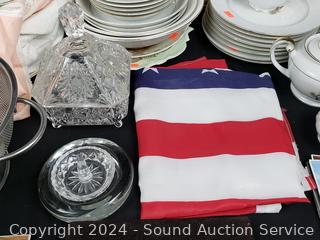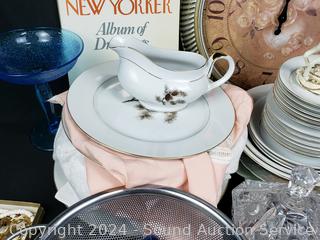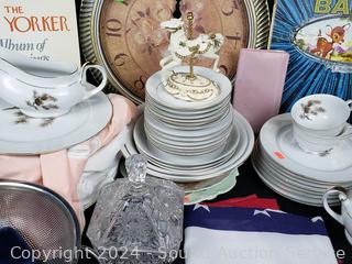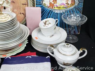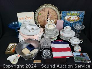 Assorted China, quartz wall clock, fashion jewelry, colander, crystal dishes, etc. Refer to photos for more details.