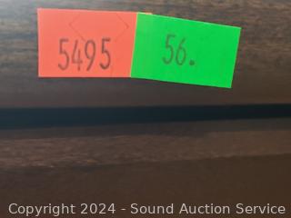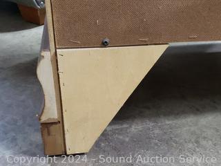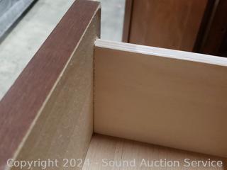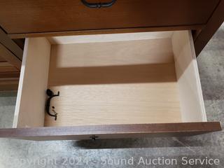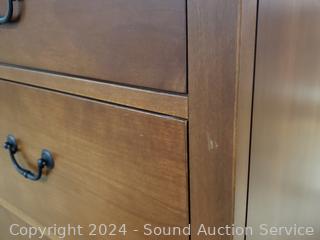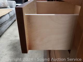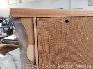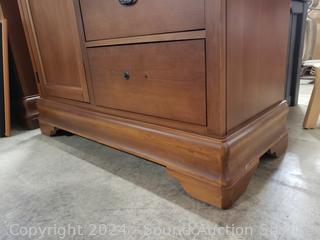 Matches the next few lots. The top skirt trim is a hidden drawer. One drawer pull is broken, not attached, comes with pieces. 3 adjustable shelves in cabinet. 62.25" H x 47.5" W x 19.75" D. A few minor scuffs, dings, overall great condition. Wood fronts.