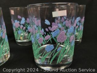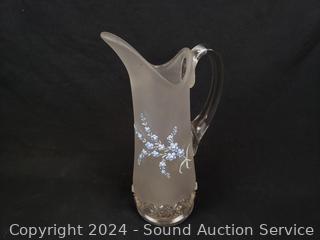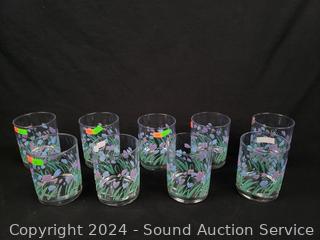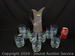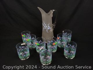 Lot #0184: High Relief Painted Floral Pitcher & 9 Highball Glasses