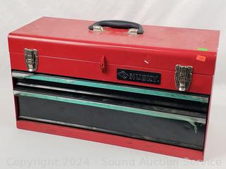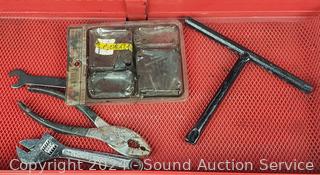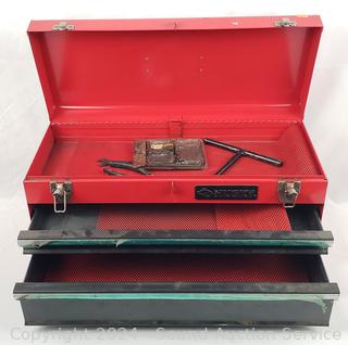 Makita saw works, comes with tons of blades & case. Central Pneumatic 6" Air Sander, untested, no fitting. Magic Miter box, 20" 2-Drawer Husky toolbox, Powercrafter air turbine carving tool. Refer to photos for more details.