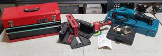 Lot #0096: Makita Reciprocating Saw, 6" Air Sander, Magic Miter Box, 21" Toolbox, Carving Tool