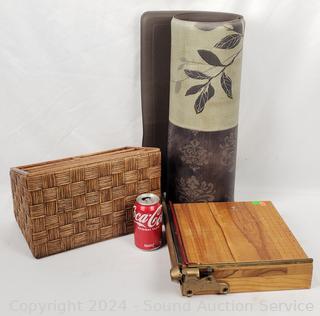 20" x 36" Memory Foam Mat, some dirty spots, wear from use. 8.25" H x 12.25" W x 8.5" D desktop organizer. Ingento 10" wood paper cutter.