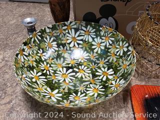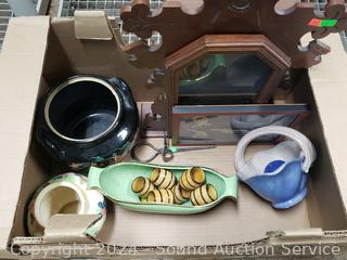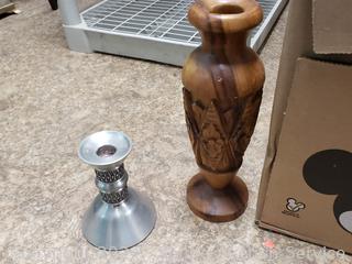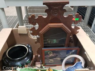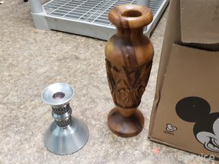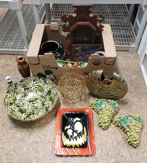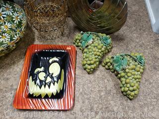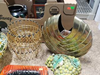 Wire baskets, brass & wood vases, been pot, small wood knick knack shelf, antique candleholder, grape ceramic wall pockets. Refer to photos for more details.