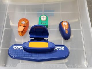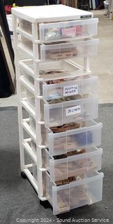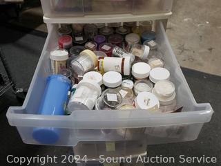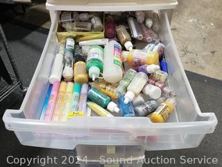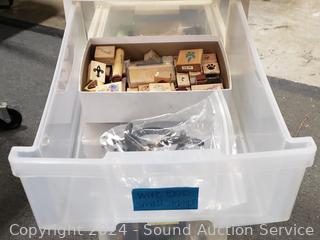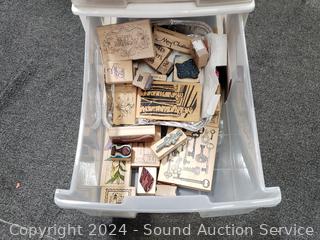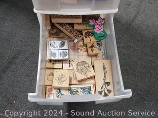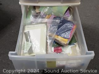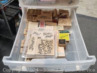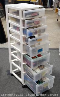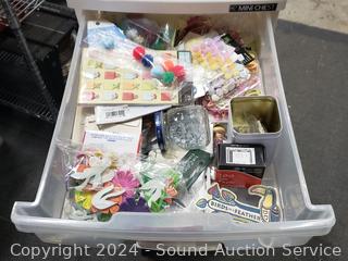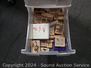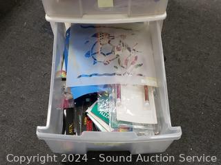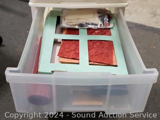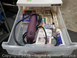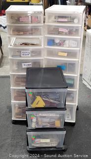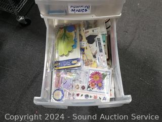 Embossing gun, glue, punches, glitter glue, wire tools, stamps, paper pieces, stencils, stylus utensils, embellishments, mounting squares, stickers, paints, pastels, etc. (2) 8-Drawer 44.25" H x 12.75" W x 16" D & (1) 3-Drawer 25.5" H x 12.5" W x 16" D.