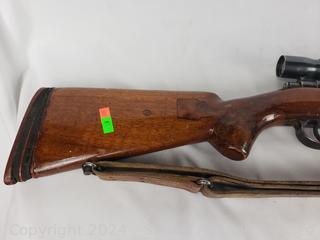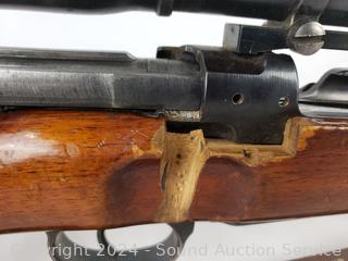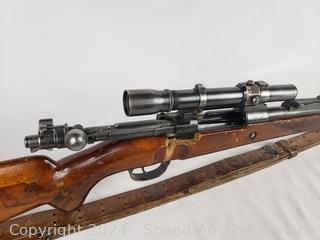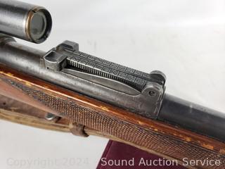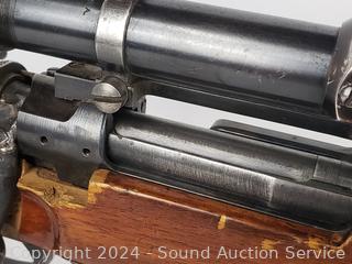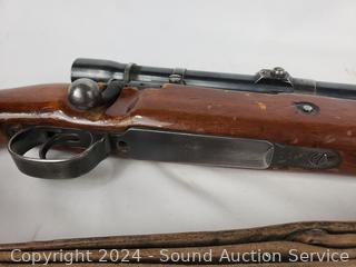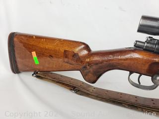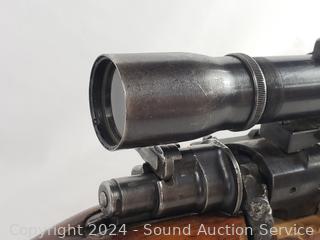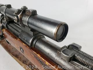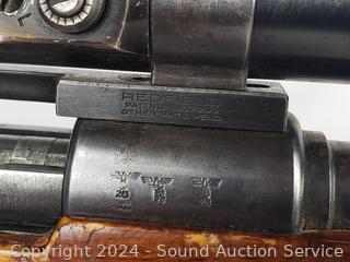 Embossed swastika eagle marks. Redfield El Paso Scope mounted. Serial 2682. Appears to be in firing condition. 23" long barrel, 44" long overall. Various wear from age, use.