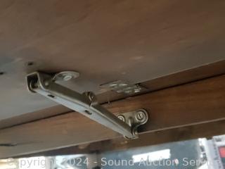 Removable tray middle shelf, wood casters, drop handle for easier movement, 11" drop leaves. 26" H x 28" x 19". Some white paint residue on the top, one support has a crack. A few scuffs, scratches in finish.