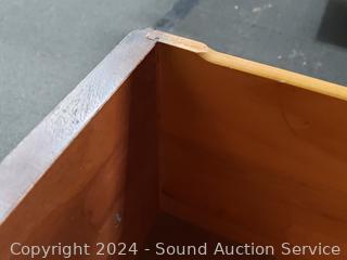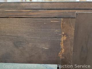 Some scuffs, scratches, wear to finish. Appears to be solid wood construction. Don't see a brand. 30.5" H x 48" W x 18" D. Seat of chair is not attached, just sitting there.