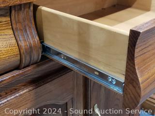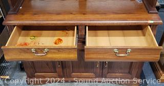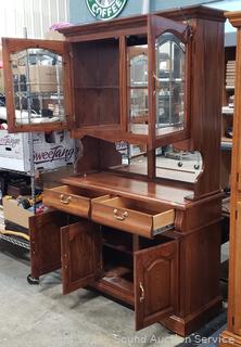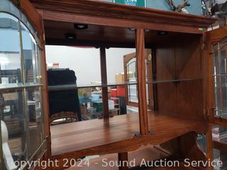 Cut glass doors, plate grooves, mirrored back, glass shelf, 2 drawers, lower cabinet. Ball bearing drawer guides. One oak accent piece on lower cabinet door pull has come free. Some staining in the drawers. 78.5" H x 48" W x 17.75" D. Appears to be all wood construction or wood fronts.