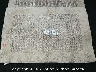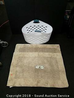 Rugs are tan, approx. 36" x 24". Laundry baskets are by Rubbermaid, approx. 24" x 16" x 14", one is missing one of the handle grips. Refer to photos for more information.