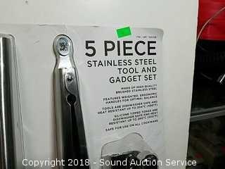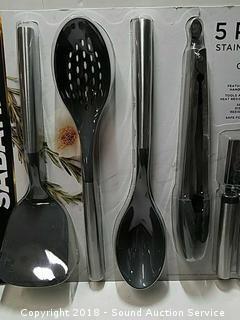 Utensils are stainless. Both are like new, appear to be unused, in original packaging. Refer to photos for more information.