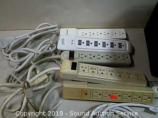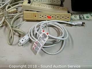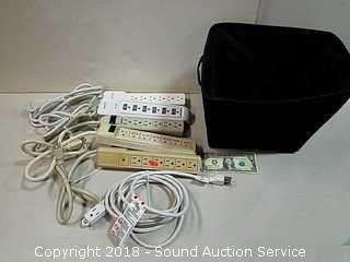 Lot #0251: Tote w/3-Way 10ft Extension Cord &(5) Power Strips