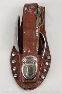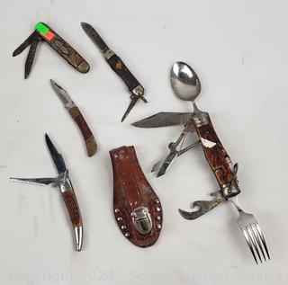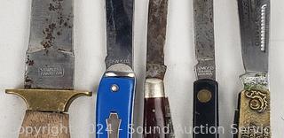 3 with damaged blades. Pakistan dagger, made in Japan spoon/fork multi tool, Imperial, Kabar, Camillus, Super Buper, Ideal & others. Various wear from age, use. Refer to photos for more details.