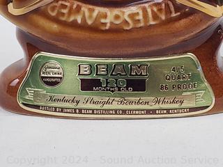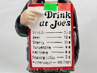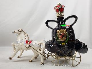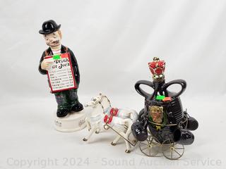 One is musical. Ezra Brooks Orca (appears to be sealed), Carriage, Jim Beam Centennial 1968, Drink at Joe's Musical. Approx. up to 13" tall.