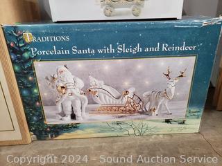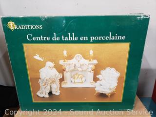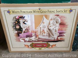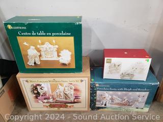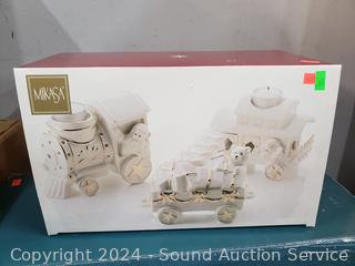 Mikasa Train Votive Set, Porcelain Santa w/Sleigh & Reindeer, Porcelain Centerpiece Set, White Porcelain w/Gold Firing Santa Set. Don't see any issues, all appear complete. Come with original packaging.