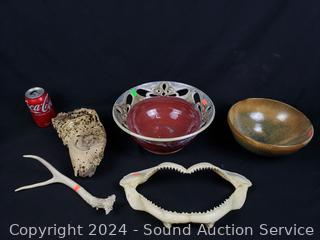 Lot #0108: Pottery Bowls, Shark? Jaw, Antler & Termite? Mound