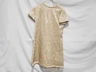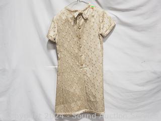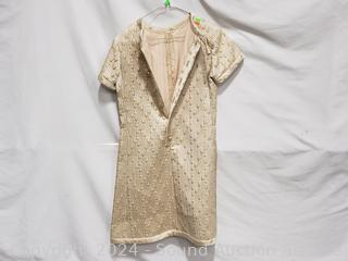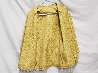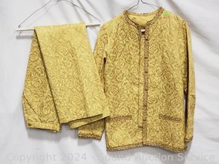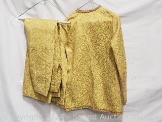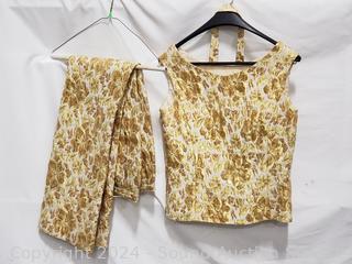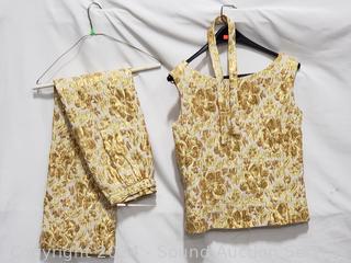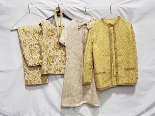 Yellow brocade 2 piece set, is cotton & acetate, union made S:10, pants have an extremely small 22" waist. Beige dress is by Suzy Perette New York, union made S:10 with rhinestone buttons. 4pc Yellow vest, pants, belt, tie I don't see a size, extremely small 22" waist, some wear to the button. Refer to photos for more details.
