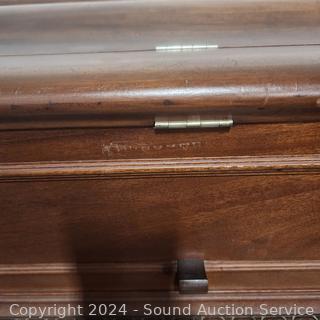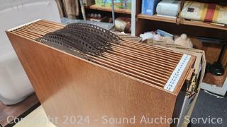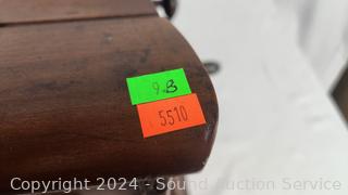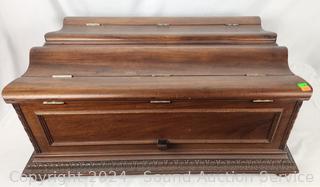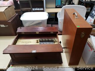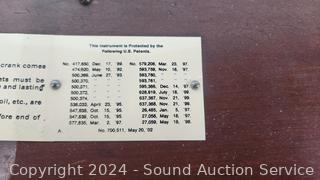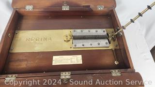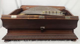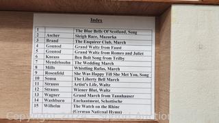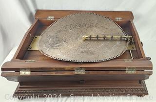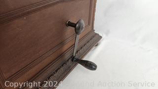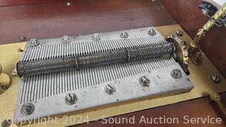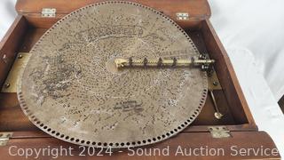 Nice wood cabinet, hand cranked. Comes with 15 20.5" music discs with a storage box 6" x 24" x 24". Comes with appraisal from c.2000 valuing it at $12,000 & a purchase receipt for deposit from 1973 for $3000. Paperwork about the box & instructions on how to use it. Appears to be functioning as intended. Refer to photos & video for more details. 12" x 39" x 20" cabinet, 85LB. Serial #32389.