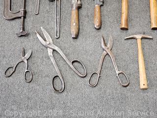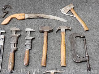Blacksmithing/pipe wrenches, hammer, mallet, hatchet, metal snips, hand saws. Refer to photos for more details.