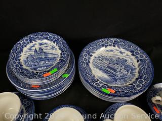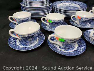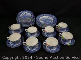 8 cups, 8 saucers, 8 snack plates, 8 bowls, 8 dinner plates. Embossed & Printed "Churchill England" marks.