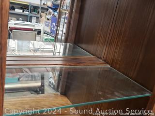 Appears to be all wood construction, or wood fronts and veneer. Mirrored top, glass shelf with plate grooves, lighted, 2 drawers, lower cabinet. Don't see any issues. 78" H x 37" W x 12" to 17.5" D.