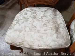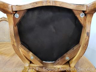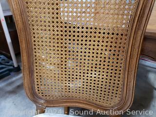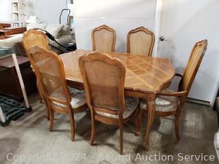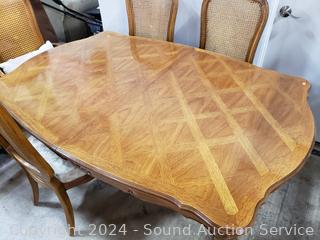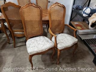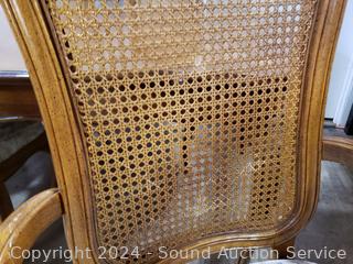 Cane back chairs w/Padded seats, 2 are captain's chairs. I do see a fee small breaks/damage to cane, very minor. Overall great condition. Refer to photos for more details. 30" H x 64" x 41" table.
