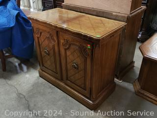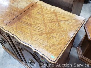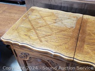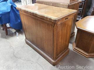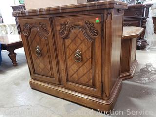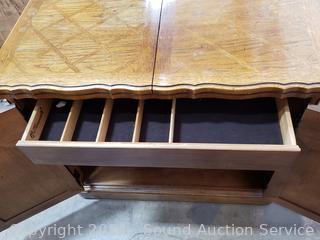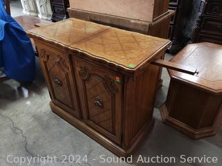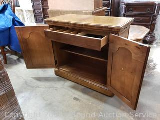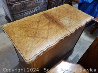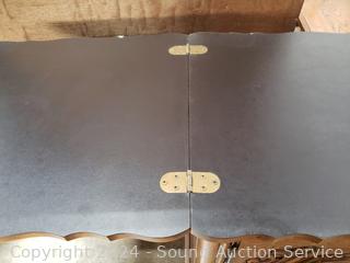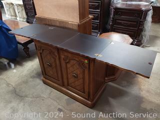 Some wear spots on the top otherwise appears to be in good condition. Top folds out, lower cabinet with drawer and adjustable shelf. Solid wood construction, dovetail joinery. 31" x 36" x 17" when closed, 82" wide when unfolded.