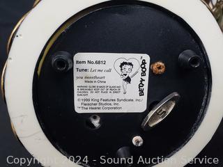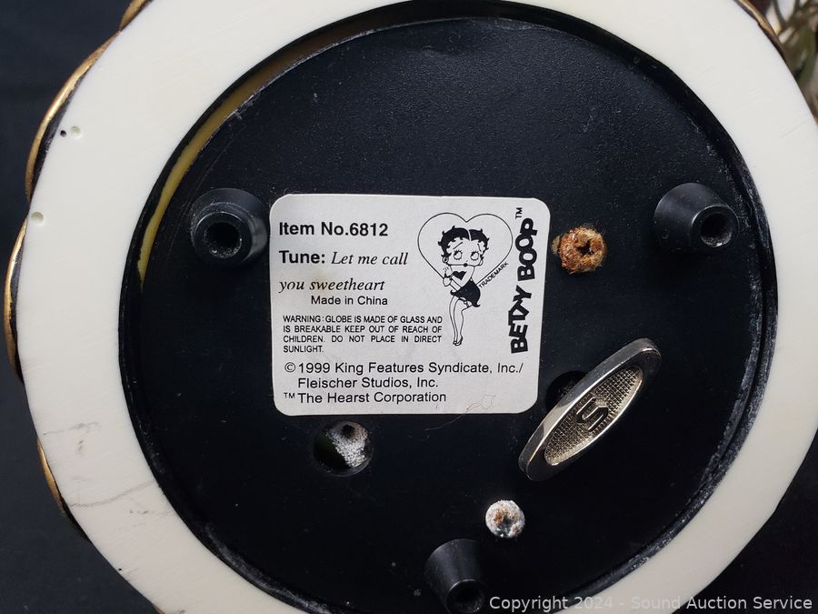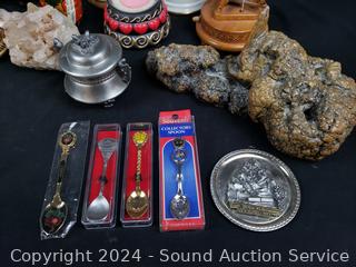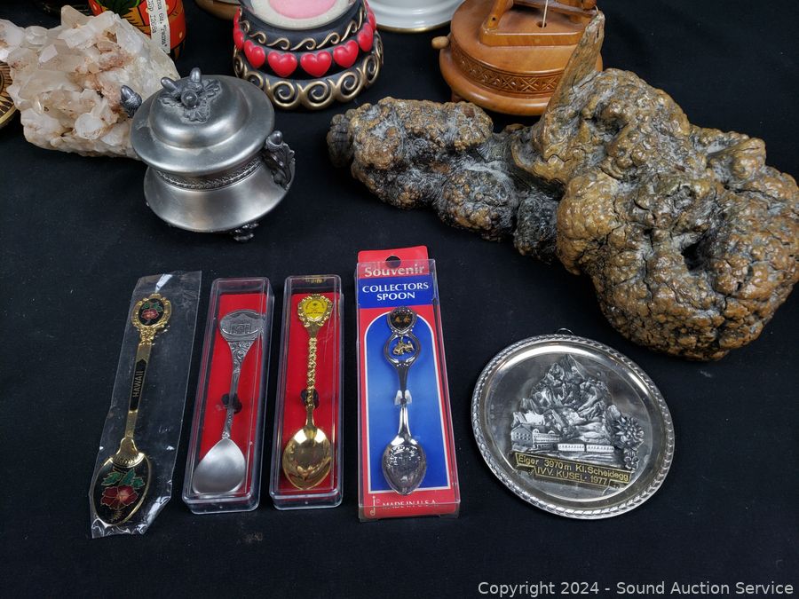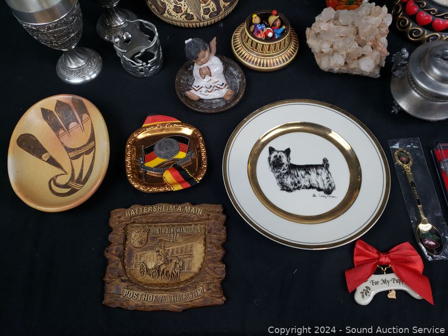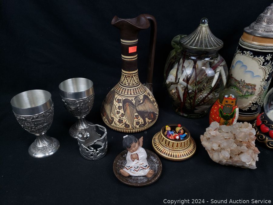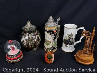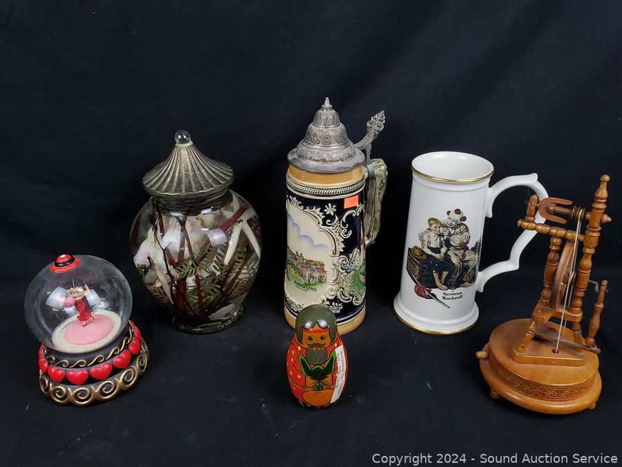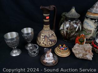 Betty Boop musical globe, German stein, museum copy pottery pitcher, crystal cluster, pewter goblets, miniature wood spindle wheel & more. Refer to photos for more details.