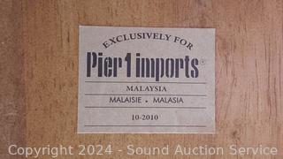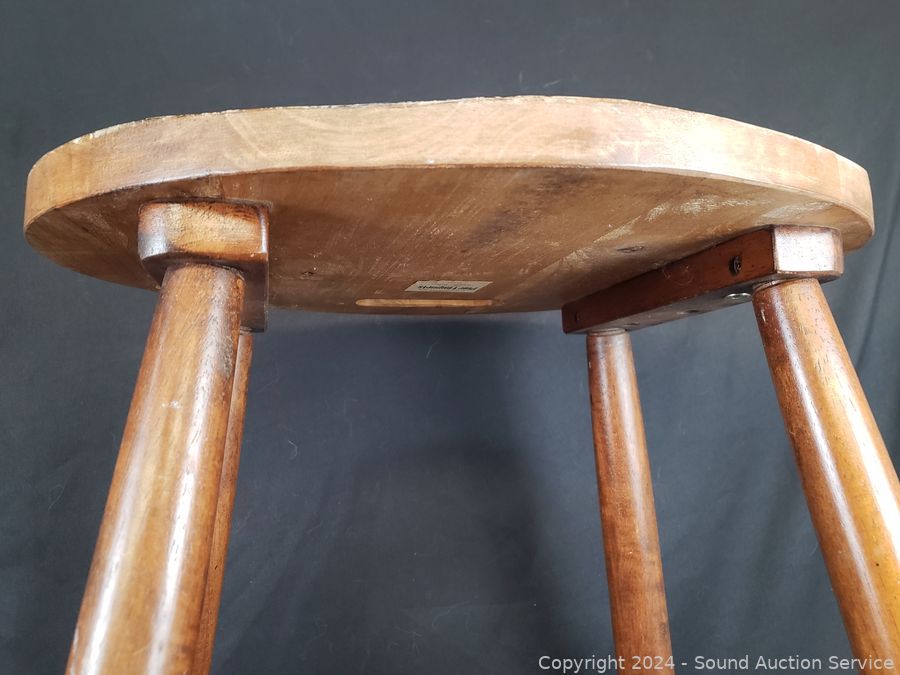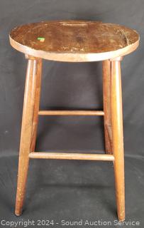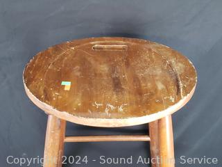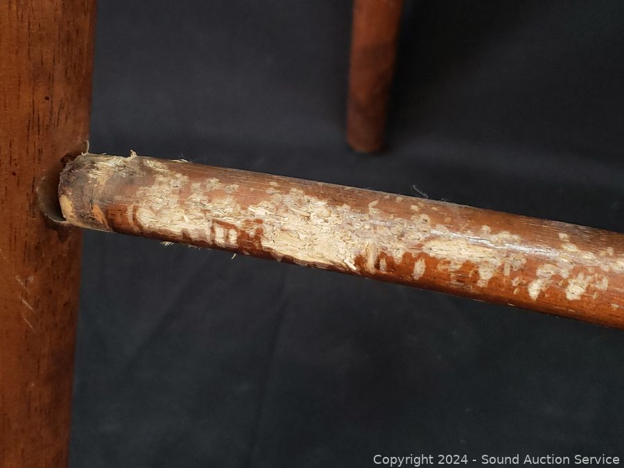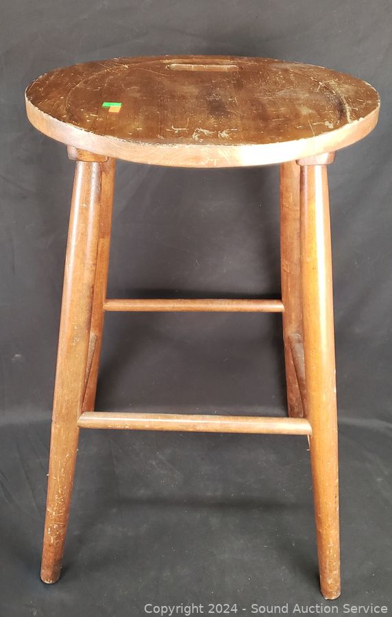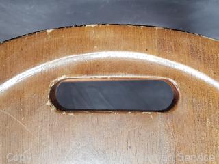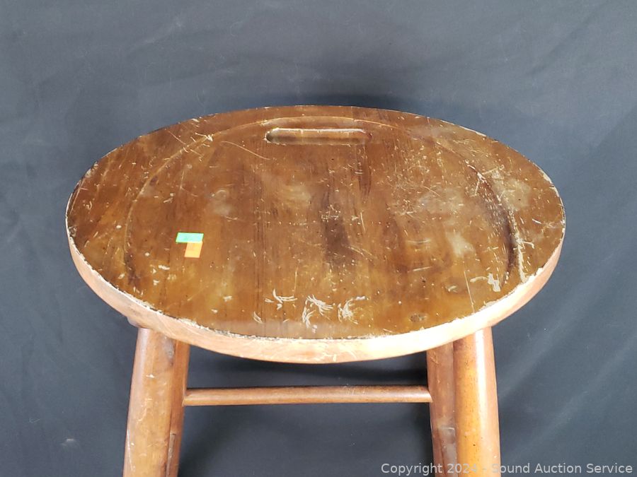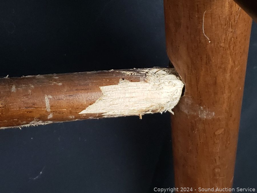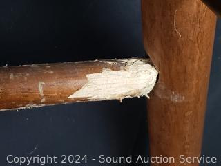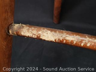 One of the cross bars has some pet damage, not attached properly, various scuffs, scratches, wear to finish. Handle cut into seat. 29.25" H x 16.25" x 13". A bit wobbly.