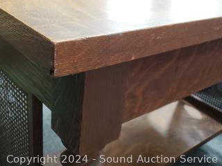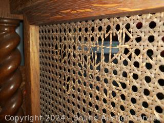 Solid tiger oak construction. Well made, sturdy. Olde patina, cane sides, some damage to the cane on both sides. 30.5" H x 44" W x 27" D.