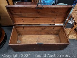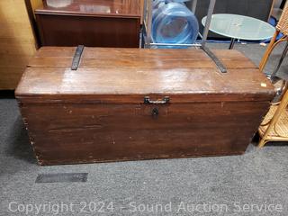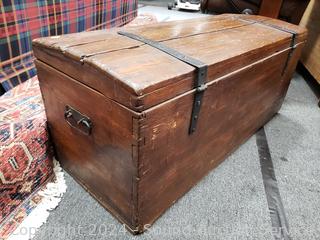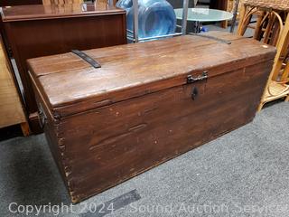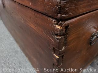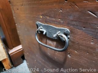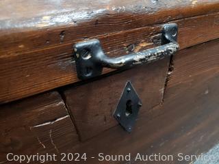 Looks very old! Hand wrought/forged handles, hardware, nails, skeleton key lock, no key. One corner is separating a bit, nails starting to come out, overall good condition given its age. 17" H x 41" W x 16.5" D.