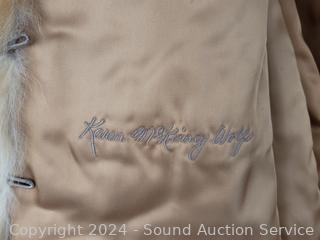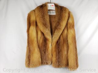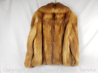 Liner is embroidered, monogrammed. Red Fox? Very soft! In great condition, some light shedding. Don't see a size, size small or medium. 24" L x 17" wide shoulders, 23" outer arm, 14" inner arm.