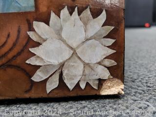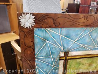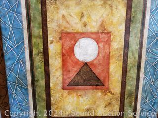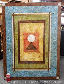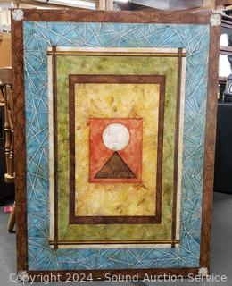 Painted on wood. Signed & titled on the back. 36" x 48". Intriguing piece, something mesmerizing about it. The colors mesh & contrast well together with embossed patterns & textures.