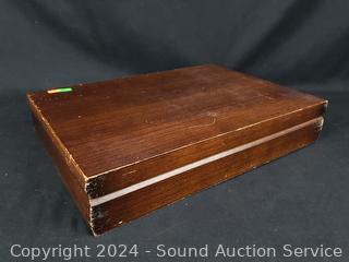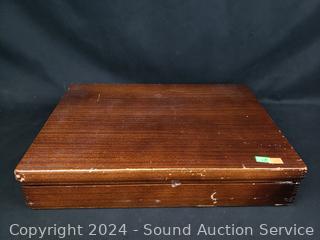 Has 1934 Pat. date. Comes with silver cloth sleeves for all. 7 salad forks, 8 dinner forks, 8 soup spoons, 8 spoons, 8 butter knives, 7 serving utensils. TW: 57.9oz = 1,642g = 3lb 9.9oz. not including butter knives. Various scuffs, scratches, wear to finish of chest.
