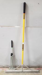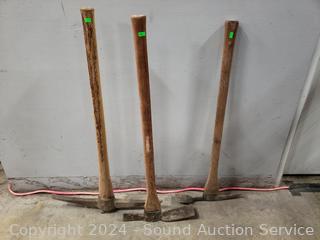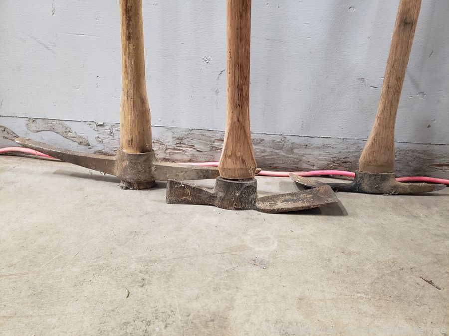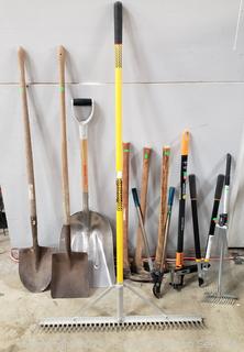 36" Construction rake, snow/farm shovel, flat shovels, leaf rake, loppers, mattocks/pickaxes, weed puller. Refer to photos for more details.