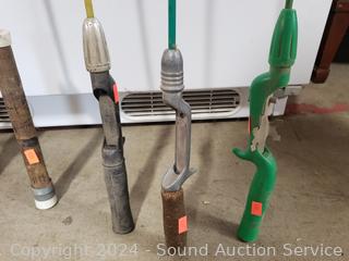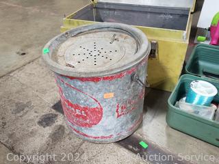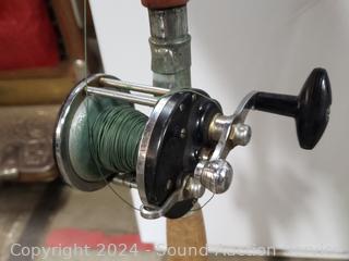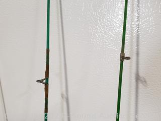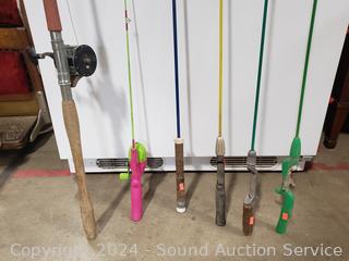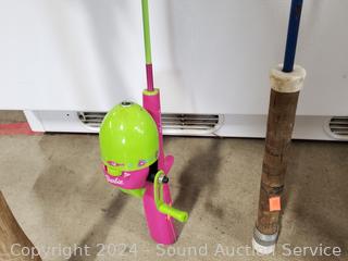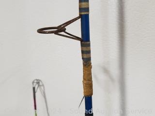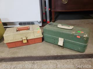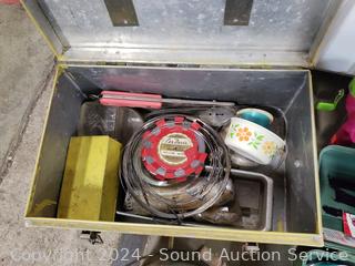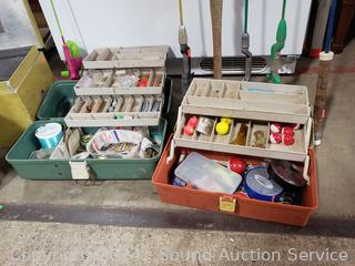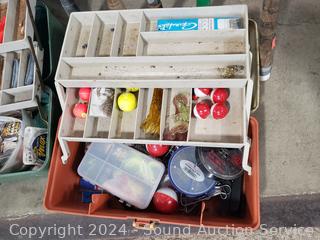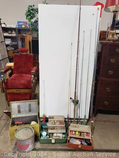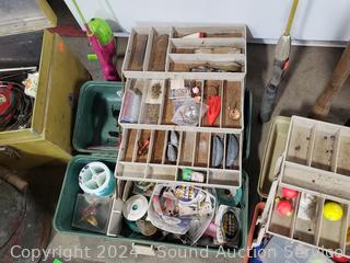 3 tackle boxes with some tackle, bait bucket, fishing rods. Various wear from use. one with a Pfleuger 1885 Reel. Approx. 30" to 7.5" length. Refer to photos for more details.