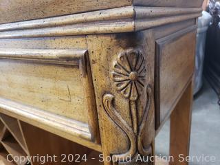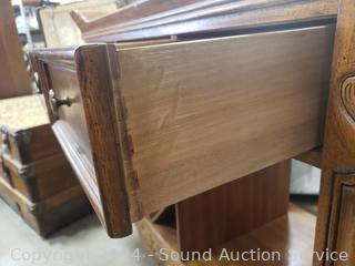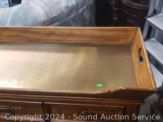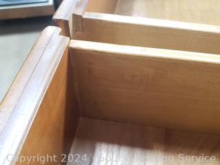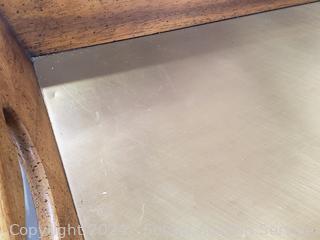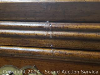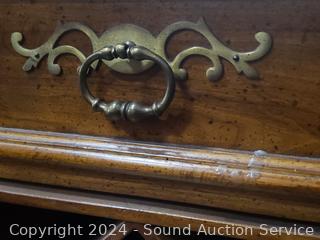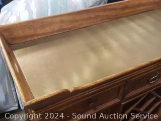 Some dings, in the brass top. Appears to be all wood construction, dovetail joinery. 35.5" H x 46" W x 18" D.