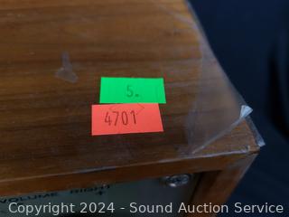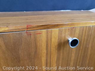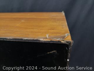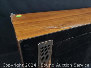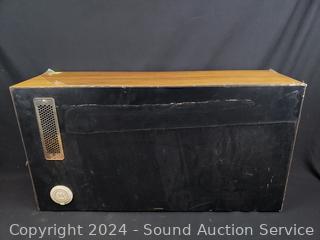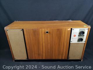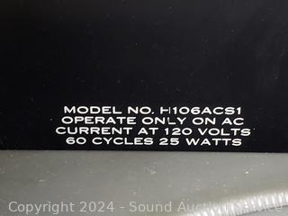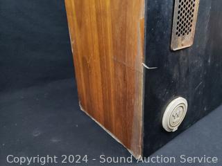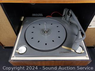 Model No. H106ACS1. Has power, turn table is barely turning. Speakers appear to be putting out sound from needle. Finish/coating coming off. 14.5" H x 27" W x 8.25" D.