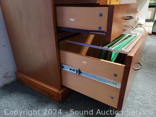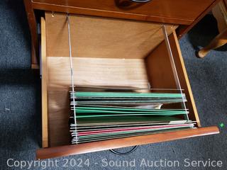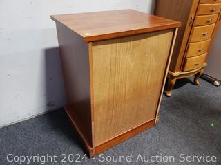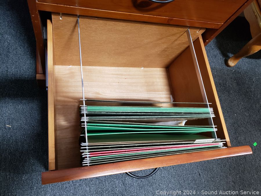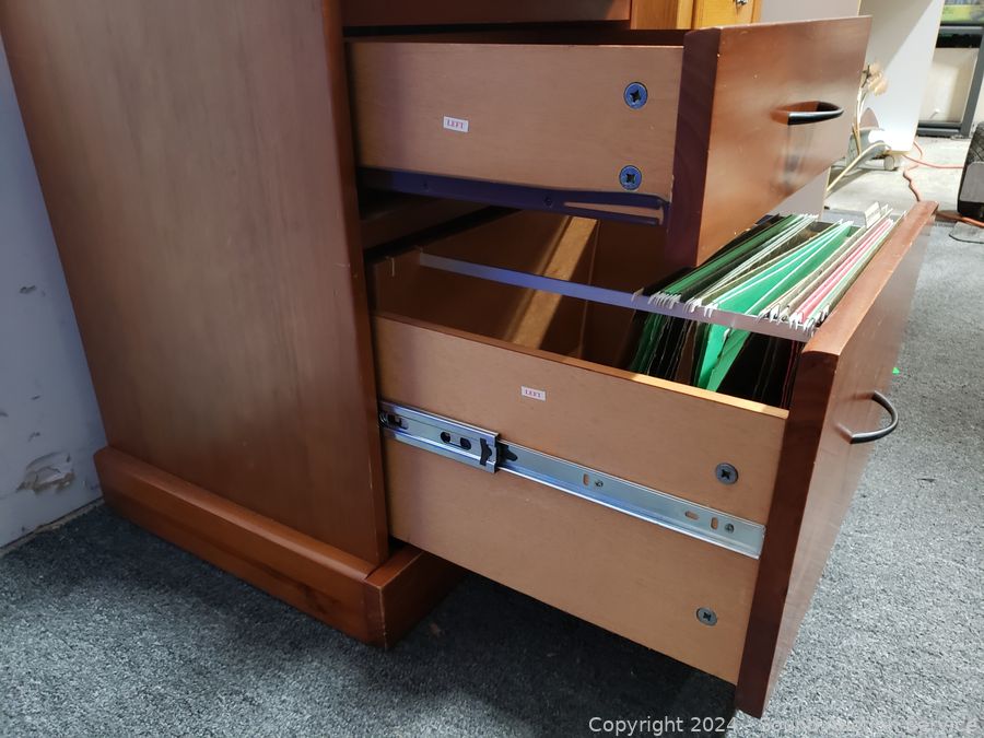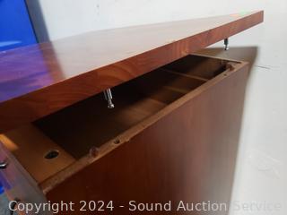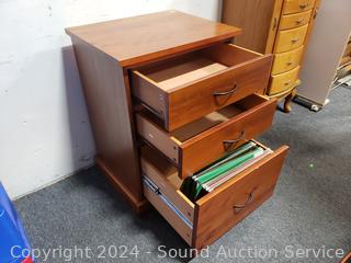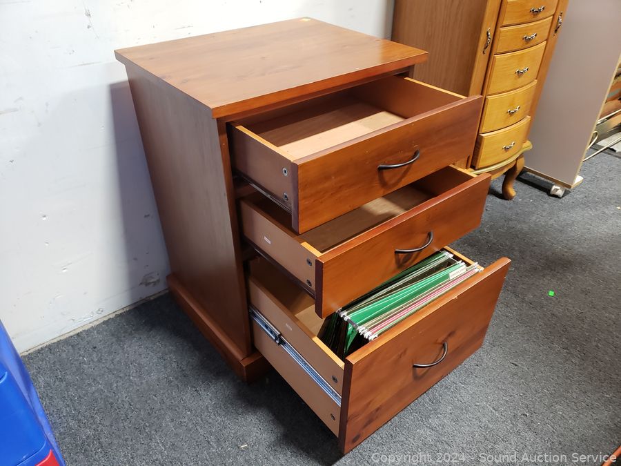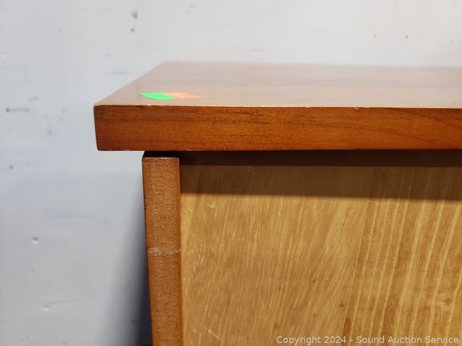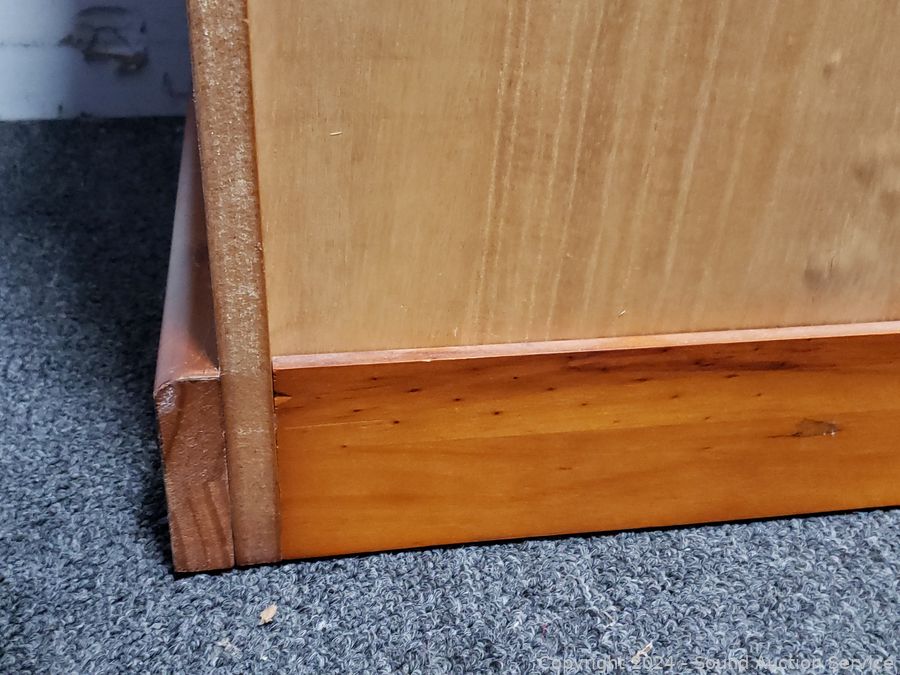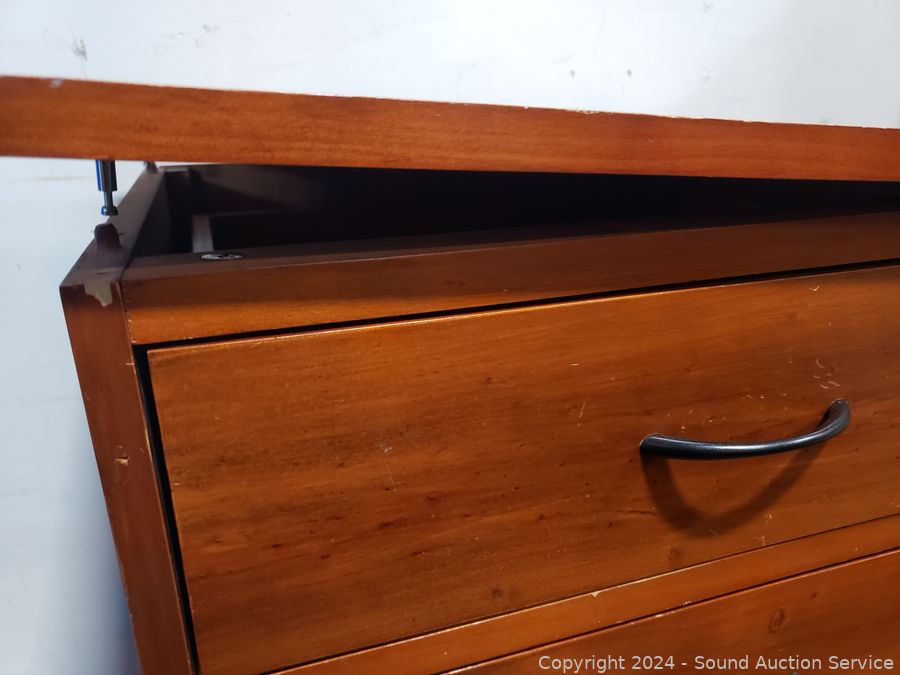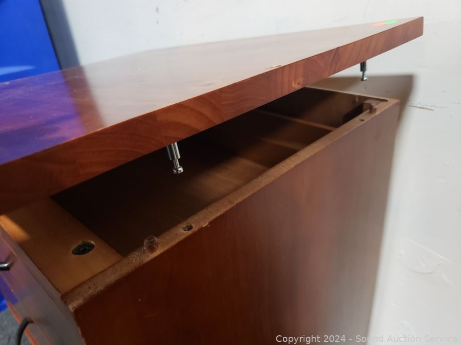 Top is loose, just sitting on there. Roller drawer guides. 28.5" H x 28" W x 17" D. Some scuffs, dings in finish.