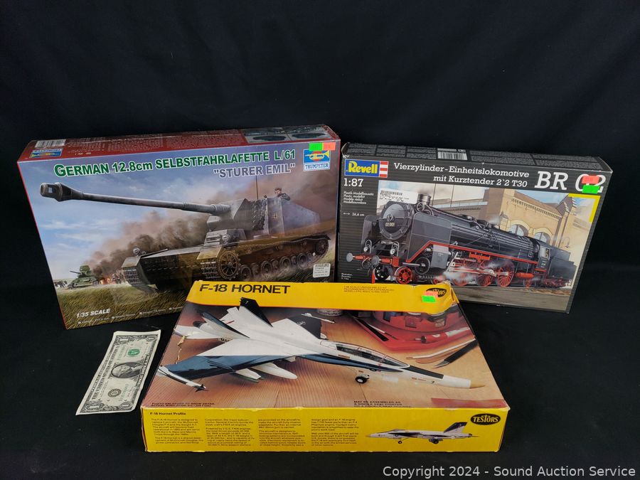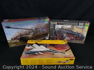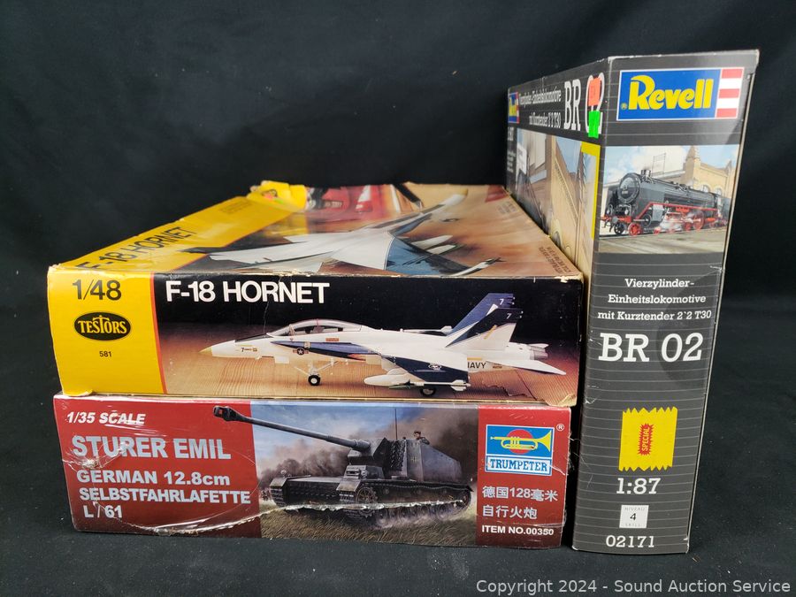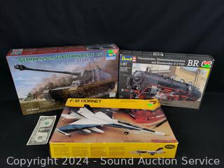 1 is sealed, 2 are opened, appear complete. F-18 Hornet 1:48 scale, Train 1:87 scale, tank 1:35 scale. Refer to photos for makes, models, more details.