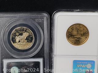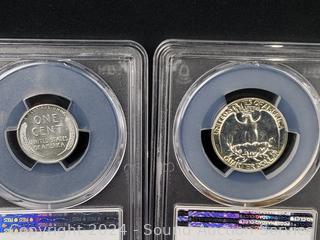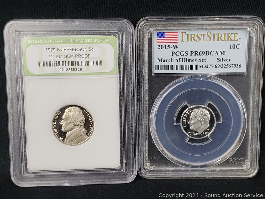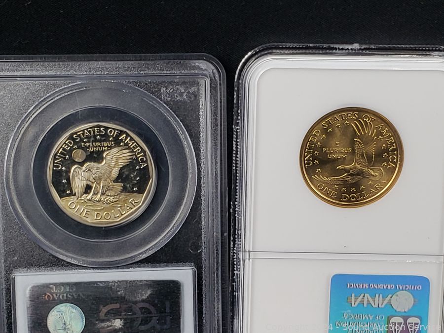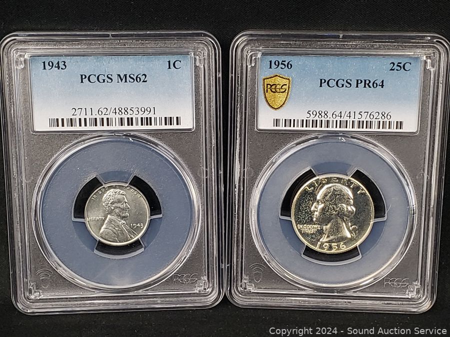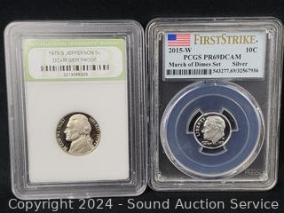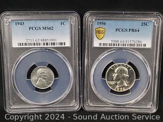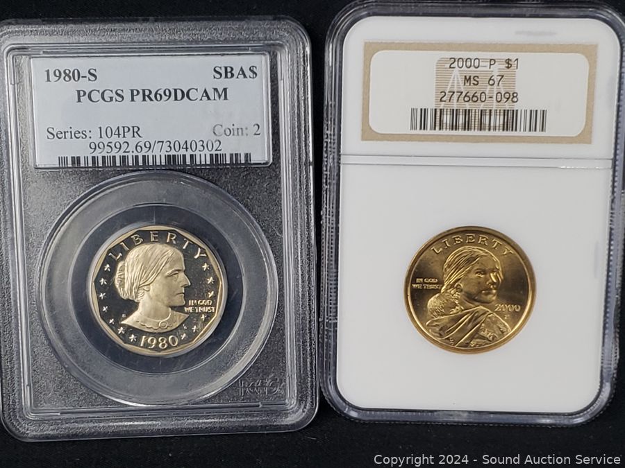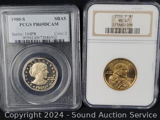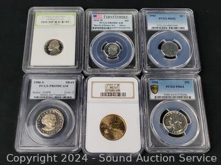 1943 Lincoln Steel War Cent PCGS MS62, 1956 Washington Quarter PCGS PR64, 1980-S Susan B. Anthony $1 PCGS PR69DCAM, 2000-P Sacagawea $1 NGC MS67, 1979-S Jefferson 5c INB DCAM Gem Proof, 2015-W Silver Roosevelt Dime PSGS PR69DCAM. ATTN: We are not coin or currency experts or graders, please use your own judgement when bidding.
