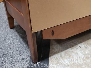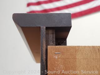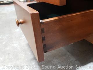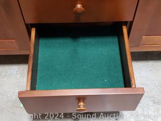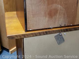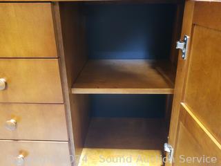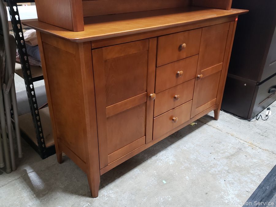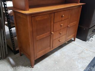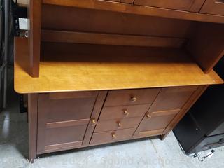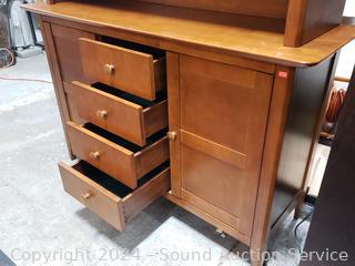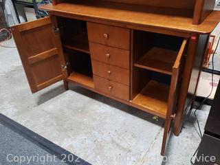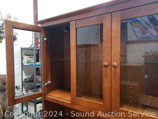 Appears to be all wood construction. Divided top section with glass shelves, 4 drawers and lower cabinets. In great cosmetic condition. 77.5" H x 51" W x 13" to 16-7/8" D.