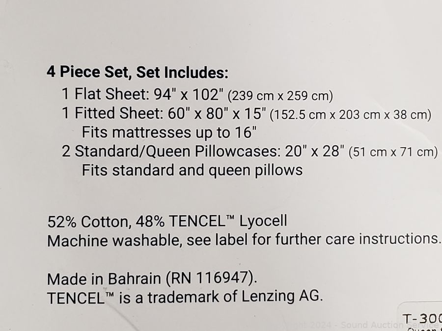300TC Cotton/Tencel. 1 flat, 1 fitted, 2 pillowcases. Don't see any issues.