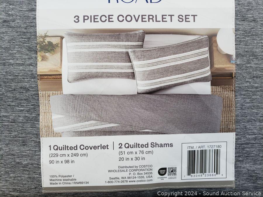 1 coverlet 90" x 98", 2 shams 20" x 30". Appears unused, don't see any issues.