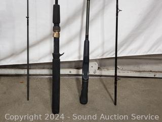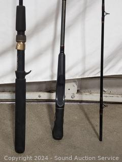 Approx. 66" to 9ft lengths, Shimano 2000GT reel, Abu Garcia Ambassador 5000 reel. Various makes, models, sizes, wear from use. Refer to photos for more details, or come in to preview.