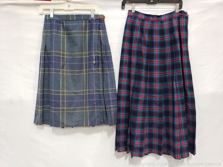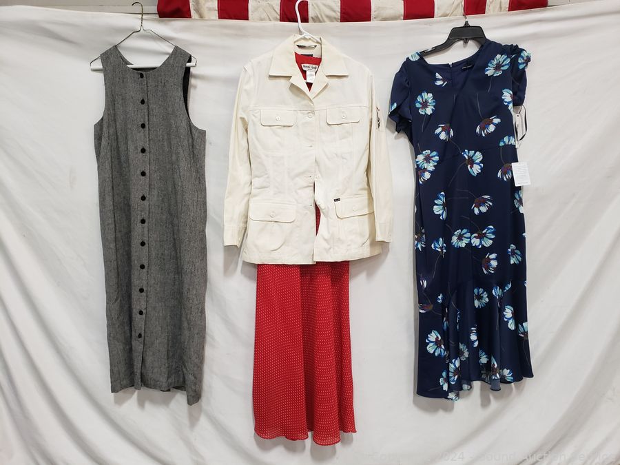 All have an odor, could use a proper wash. Maggy London Dress S:4 (still has original $148 price tag), Ronni Nicole Dress S:6, Faconnable Ivory Jacket S:S, Ralph Laurne Plaid Skirt S:8, Christopher Banks S:S, Dress Barn S:8 Pants & Slacks, Pendleton Plaid Skirt, Alpaca Sweater S:Sm, Aegean Cap. Don't see any major issues.