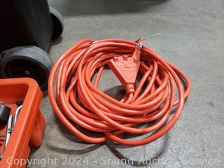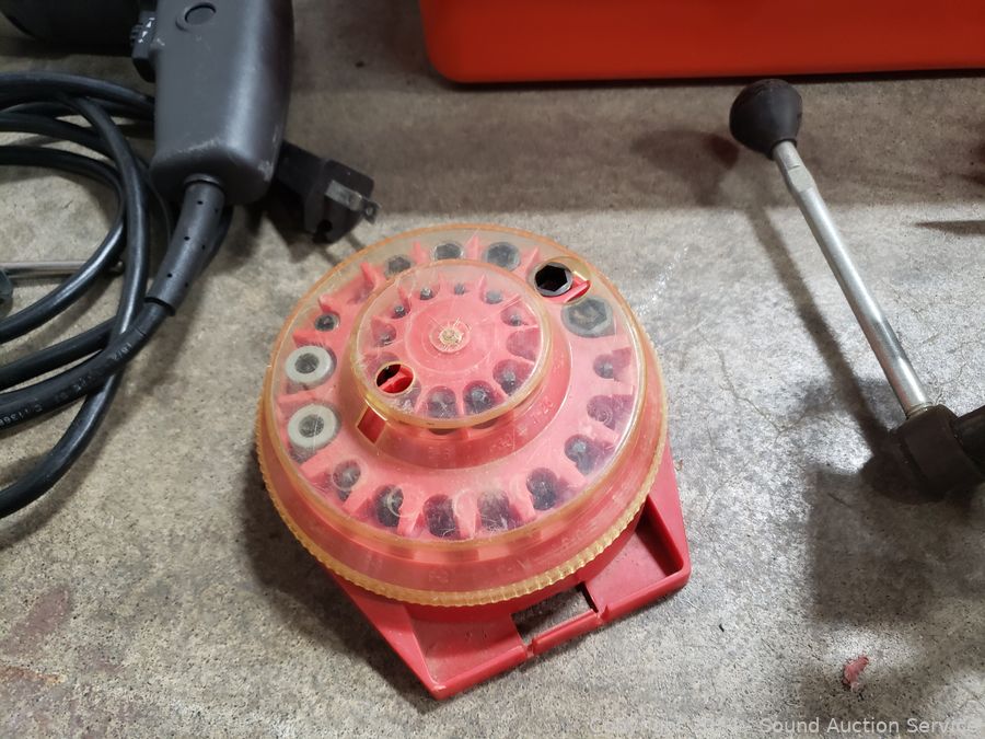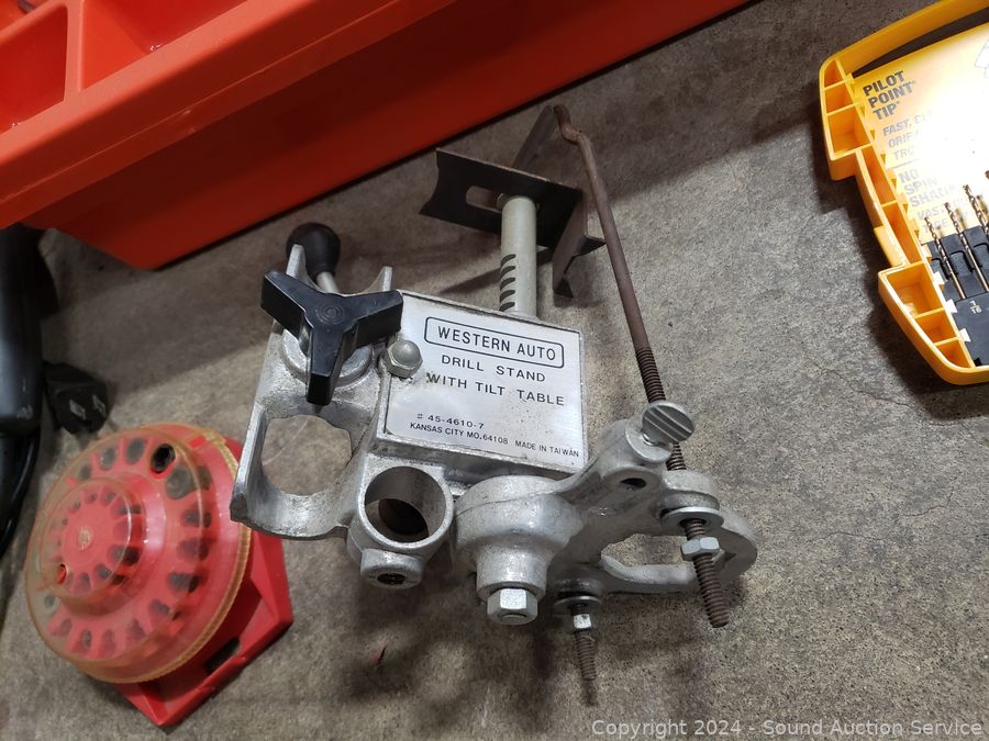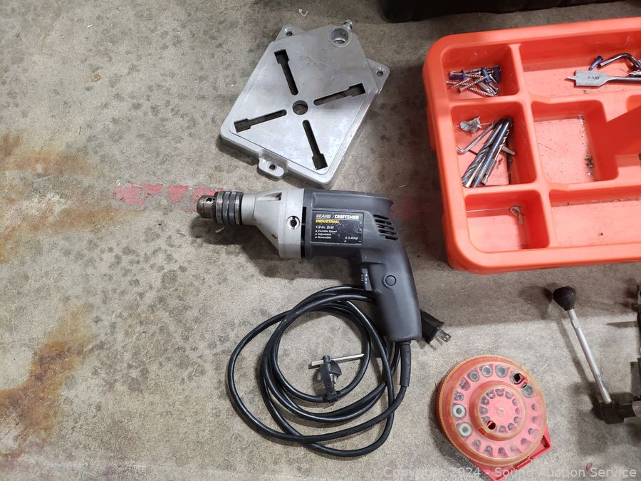 Craftsman 1/2" drill, works, 3-way extension cords, various bits, drill stand. 16" H x 25" x 13.5". Refer to photos for more details.