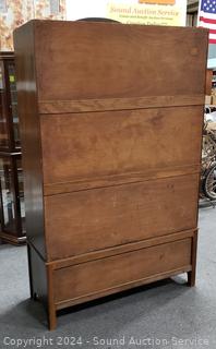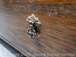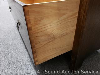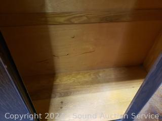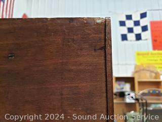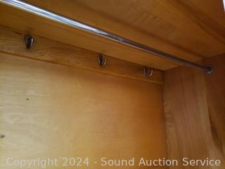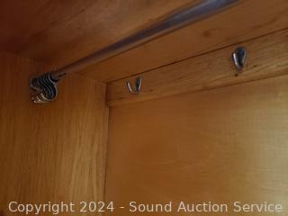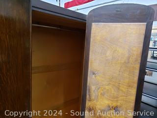 All wood construction. Skeleton key lock, no key. Beveled mirror, hanging rod & hooks. 2 piece for easier movement. 76" H x 46" W x 16.5" D.