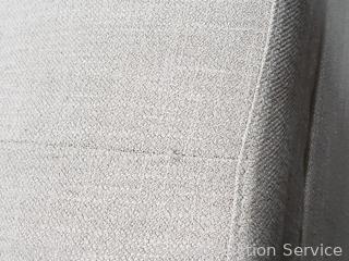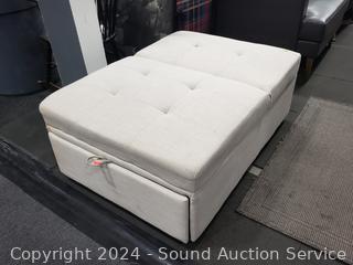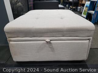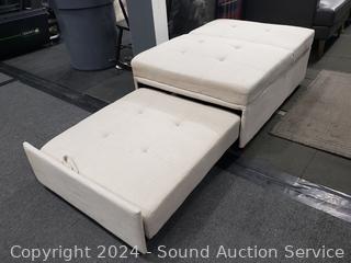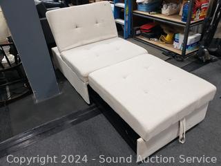 Has an adjustable back that can lay flat, drawer that pulls out and lifts turning it into a chaise lounger. Some pilling, loose threads, otherwise in great condition. Approx. 34" H x 75" L x 31" W opened, 17" H x 42" x 32". Refer to photos for more details.