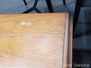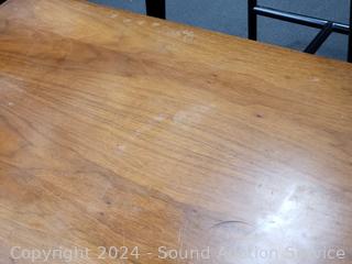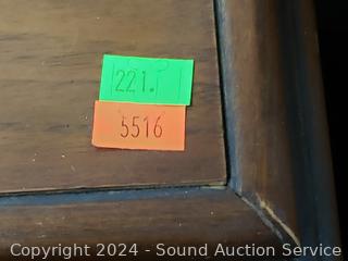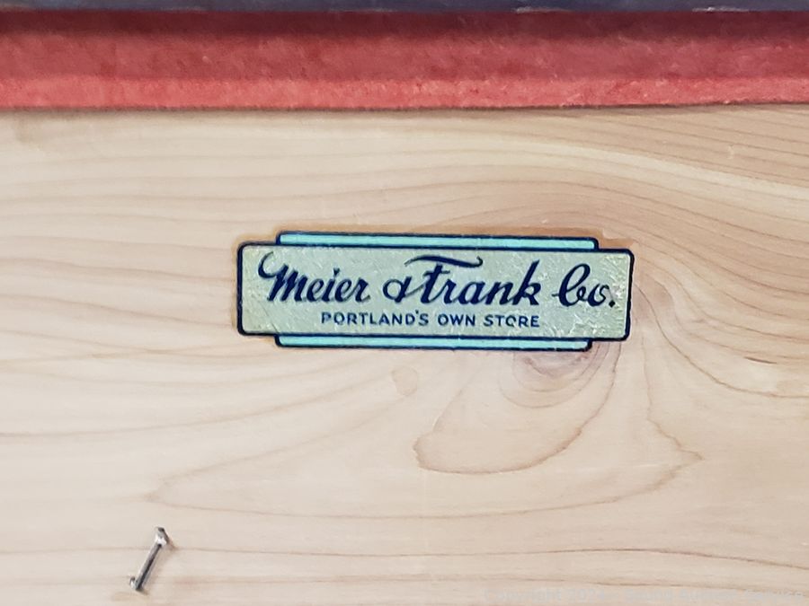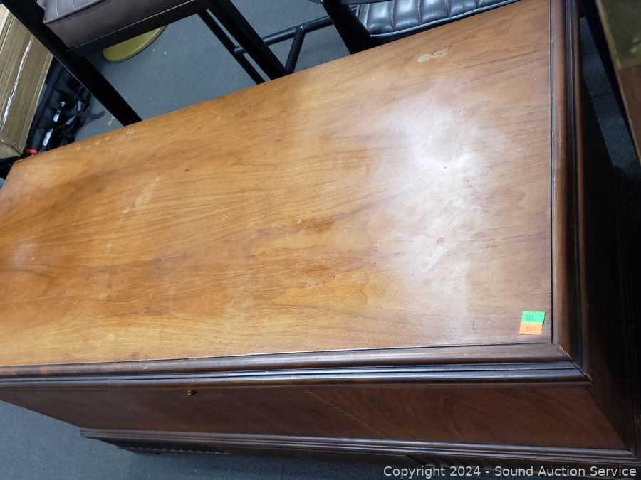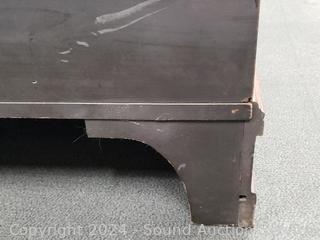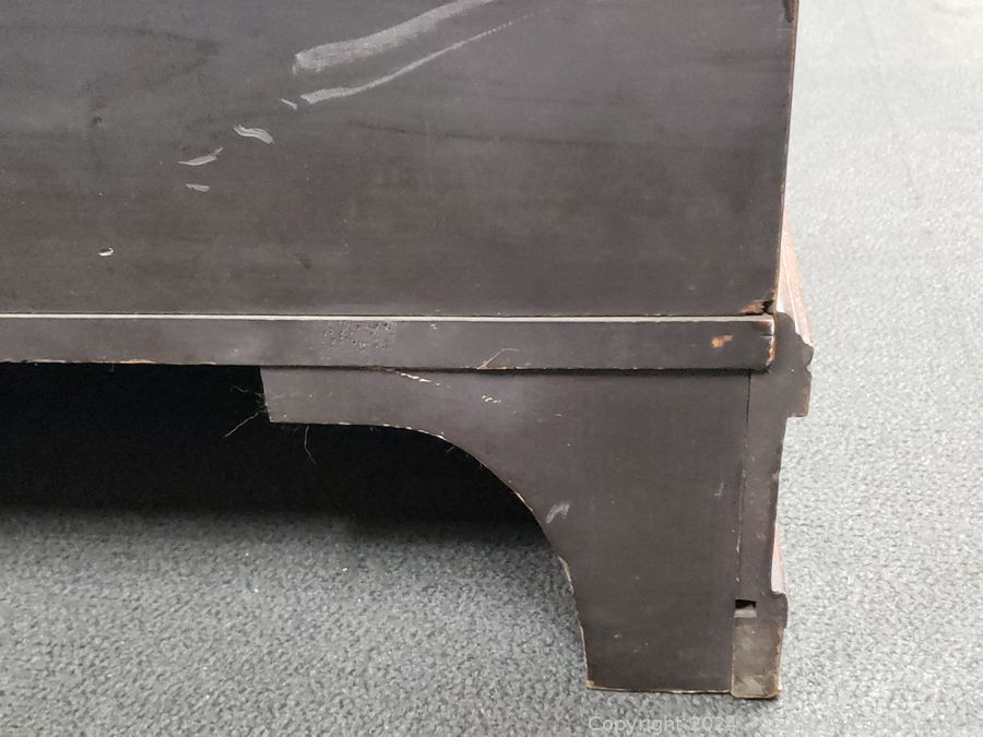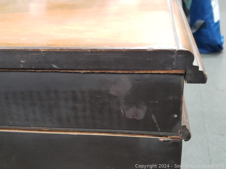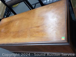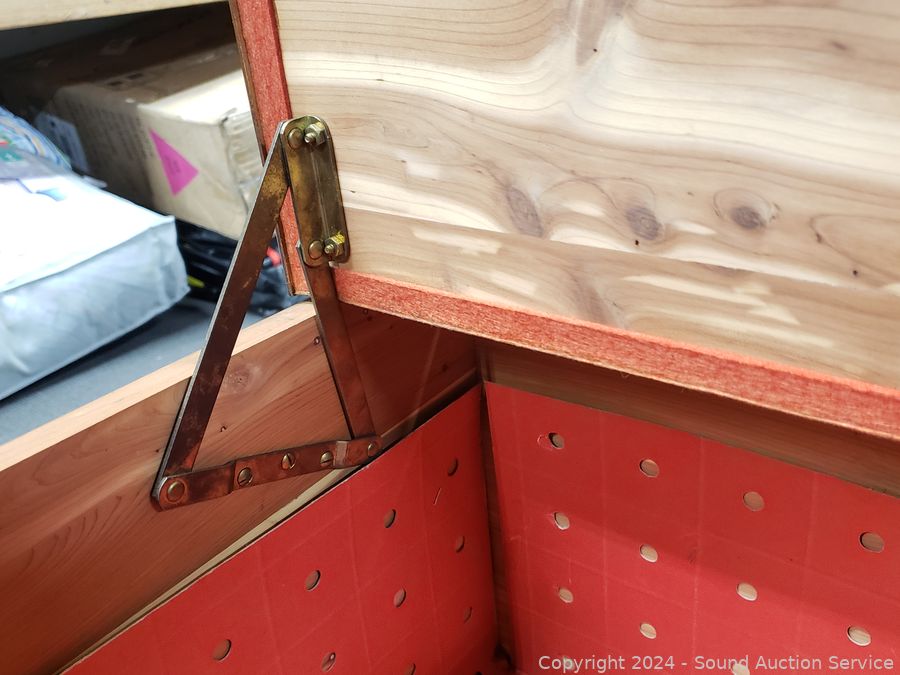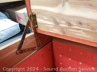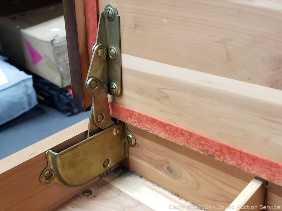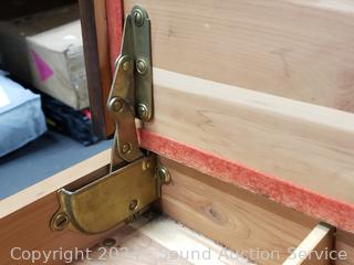 Top opens in 2 ways, a divided tray section & chest. 22.5" H x 45" W x 18.75" D. Some scuffs, wear to finish, overall in great condition.