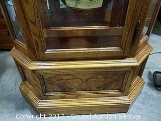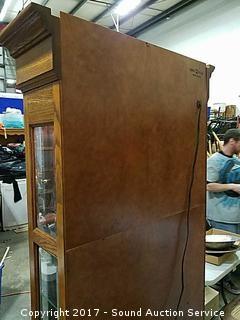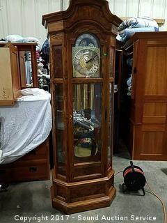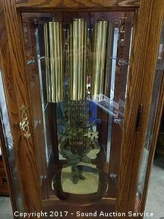 Beveled glass inserts, glass shelves, W. German movement, case made in USA, lighted, comes with original door and clock key. Appears to be in mint condition. Comes with original paperwork. Approx. 81" tall, 25.5" wide and 14" deep.